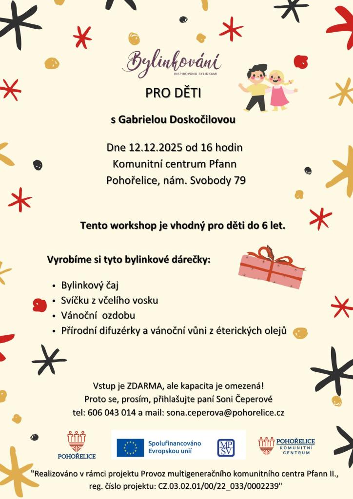Workshop Bylinkové dárečky se koná 12.12.2025 od 16 hodin v Komunitním centru Pfann v Pohořelicích. Je určen pro mladé lidi do 6 let. Účastníci si vyrobí různé bylinkové dárečky, včetně bylinkového čaje a svíčky z včelího vosku. Vstup na akci je zdarma, ale prosíme o registraci předem, jelikož kapac