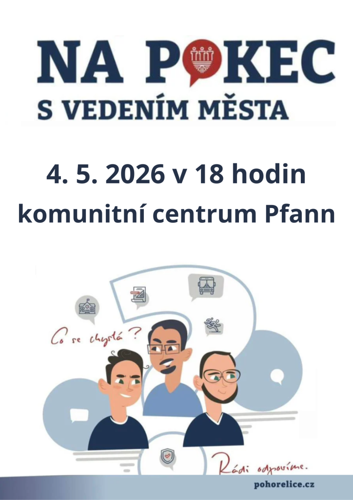 Zveme vás na Pokec s vedením města, který se koná každé první pondělí v měsíci. Přijďte se zeptat na to, co vás zajímá.
