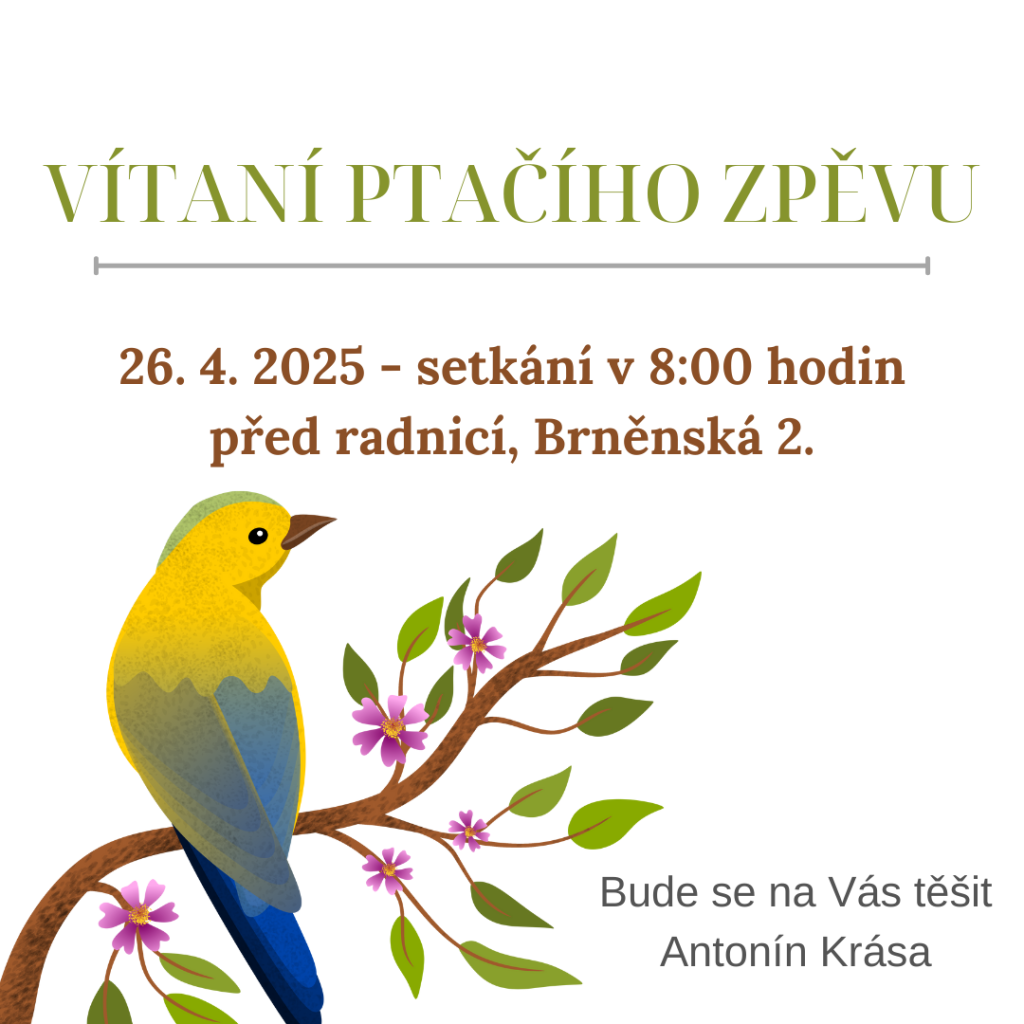 Přijďte si užít Vítání ptačího zpěvu, které se koná 26. dubna 2024 od 8:00 hodin před radnicí na Brněnské 2. Těšit se na vás bude Antonín Krása. Nezmeškejte tuto jedinečnou příležitost spojit se s přírodou!