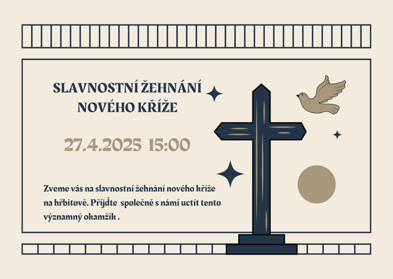 Zveme vás na slavnostní žehnání nového kříže na hřbitově, které se uskuteční 27. dubna 2025 v 15:00. Přijďte si společně s námi uctít tento významný okamžik a sdílet duchovní atmosféru s ostatními.